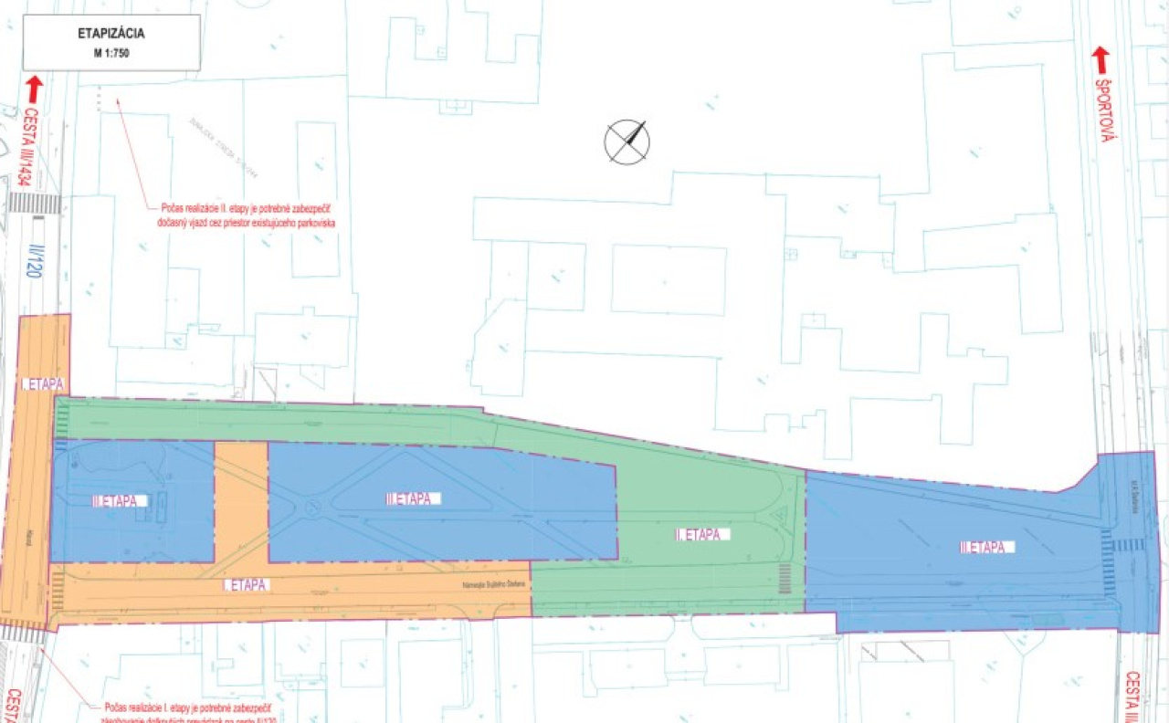 Realizáciu projektu rozdelia do troch etáp tak, aby zostalo zachované fungovanie okolitých inštitúcií. Mesto nechce narušiť chod gymnázia, spojenej školy, špeciálnej materskej a základnej školy, prokuratúry ani ďalších úradov.