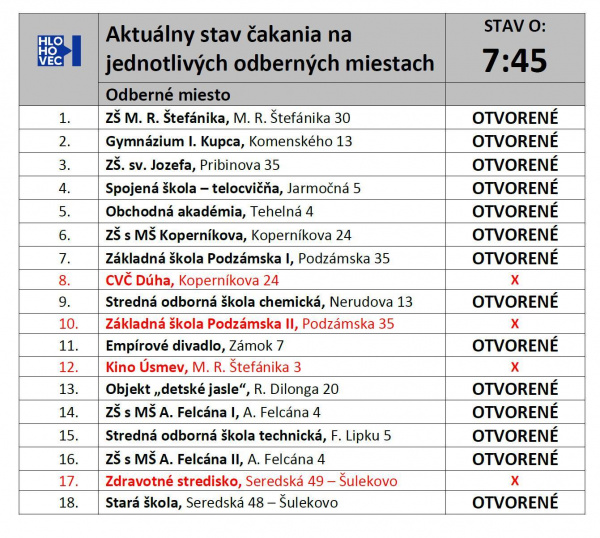 Hlohovec má otvorených 14 z 18 odberných miest. Pred všetkými odbernými miestami sú momentálne niekoľkohodinové rady, primátor Miroslav Kollár odporúča odložiť príchod na odberné miesto na neskôr.